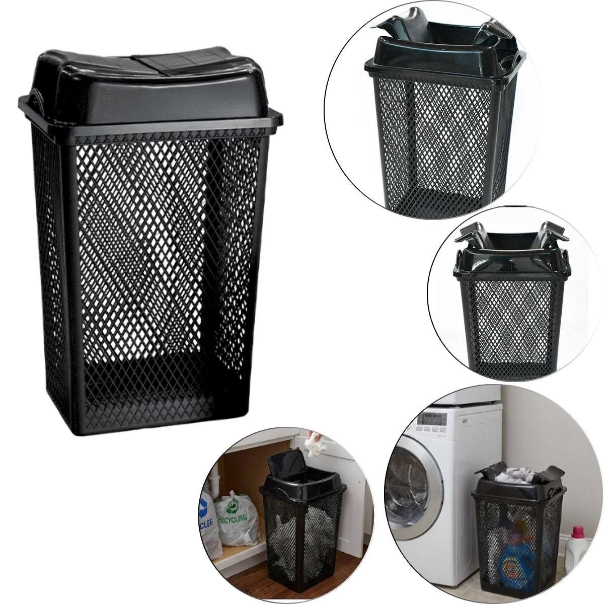 A tampa articulada deixa o uso rápido e prático, sem drama. E o corpo telado garante boa ventilação, evitando cheiro preso e aquela vibe de depósito esquecido.