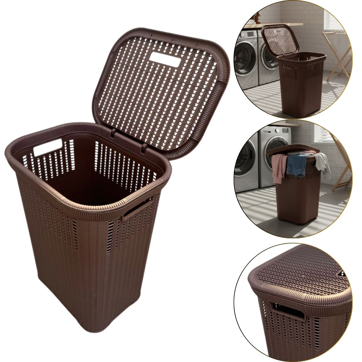 Sua capacidade de 50 litros oferece amplo espaço interno, enquanto a tampa removível mantém o conteúdo protegido e garante um visual sempre discreto e harmonioso. Fabricado em polipropileno resistente, o cesto é leve, durável e fácil de higienizar, ideal para o uso diário.