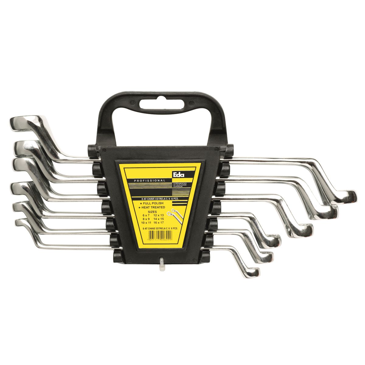Jogo de Chaves Estrela contém 06 peças produzidas em aço cromo-vanádio, proporcionando durabilidade e resistência. Indicada para aperto e desaperto de porcas e parafusos.