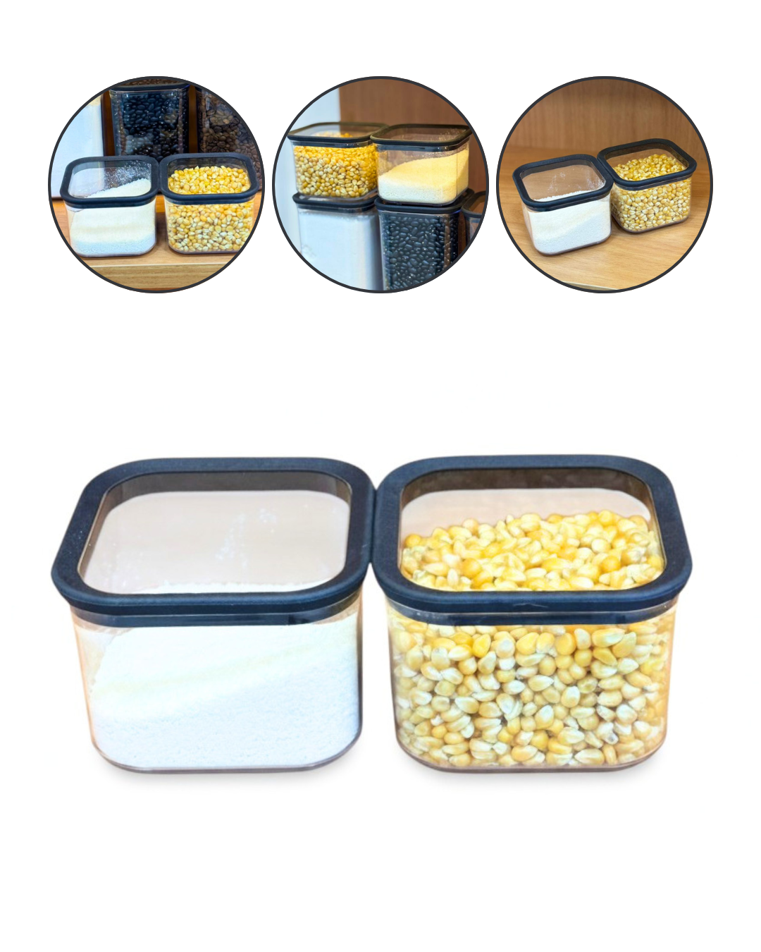 Tampa hermética em borracha termoplástica bloqueia odores e umidade, material em poliestireno seguro para alimentos.