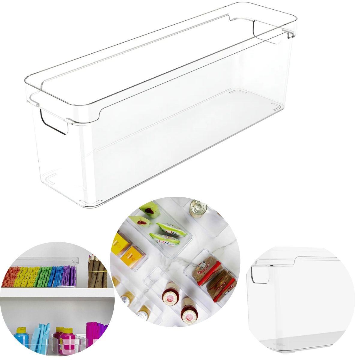 Descrição Geral: Para quem ama organização, este produto é especial! Os Organizadores Clear são excelentes para manter tudo no lugar, seja na geladeira ou no armário da lavanderia. Seu design permite uma organização prática e versátil e sua transparência faz com que o conteúdo fique perfeitamente visível. Possui duas alças laterais que facilitam o transporte e a possibilidade de empilhar os organizadores, otimizando o espaço. Ideal para armário e geladeira. Benefícios do produto: - Organizar seu armário ou geladeira; - Otimizar seu espaço; - Produto livre de BPA Especificações Técnicas: Matéria: Poliestireno Cor/acabamento: Transparente Altura: 13cm Largura: 10cm Profundidade: 37cm Este produto é livre de BPA, não é adequado para freezer ou microondas. Recomenda-se higienizar com sabão neutro e esponja macia, evitando produtos abrasivos.