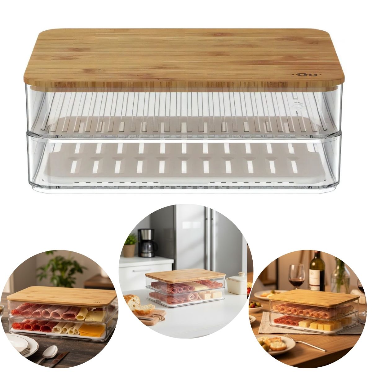 Organizador Porta Frios Clear Fresh Duplo Com Tampa de Bambu Mesa Posta Ou ::ATENÇÃO, COMO INFORMADO NAS IMAGENS ESTE PRODUTO TEM A FINALIDADE DE COMPOR A MESA, NÃO É RECOMENDADO LEVAR A GELADEIRA POIS A TAMPA DE BAMBU PODE EMPENAR. O Porta Frios Duplo Clear Fresh Com Tampa Bambu traz personalidade e versatilidade para armazenar e servir frios de forma simples e prática, promovendo beleza e funcionalidade para o dia a dia e ocasiões especiais. Empilhe, encaixe e enxergue facilmente os frios armazenados, mantendo tudo em ordem. A tampa de bambu promove a sustentabilidade de um material 100% renovável. Com design minimalista, ele combina com todos os tipos de cozinha, trazendo harmonização entre cor e transparência. Outro diferencial da linha está na sua superfície interna que possui uma grade e ranhuras, além de uma base removível que evitam o contato dos frios diretamente na superfície do produto. Diferenciais: - Fácil de limpar; - Resistente e durável; - Atóxico (BPA Free); - Com tampa de Bambu; - Suporte duplo encaixável; - Com 1 bandeja de drenagem removível; Especificações: - Marca: OU; - Referência: PFB150 - Cor: Incolor e Bambu; - Modelo: Clear Fresh; - Composição: Poliestireno, Bambu e Polipropileno. Dimensões: - Altura: 7,5cm; - Largura: 15,5cm; - Comprimento: 20,5cm; - Peso Total: 450g. Cuidados: Este produto é BPA Free, não deve ser levado ao freezer, lava louças e ao micro-ondas. Não vai a geladeira. Para garantir uma melhor durabilidade, sugere-se higienizar o mesmo com sabão neutro e esponja macia, evitando produtos abrasivos no processo de limpeza. higienizar o mesmo com sabão neutro e esponja macia, evitando produtos abrasivos no processo de limpeza.