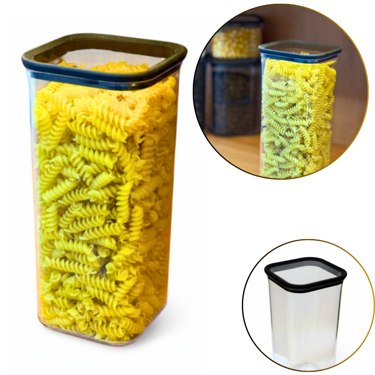 Tampa hermética em borracha termoplástica bloqueia odores e umidade, material em poliestireno seguro para alimentos.