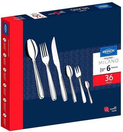 | Composição | 01 Faqueiro 36 peças Composição: 06 Colheres de Mesa 06 Garfos de Mesa 06 Facas de Churrasco 06 Colheres de Sobremesa 06 Garfos de Torta 06 Colheres de Chá |